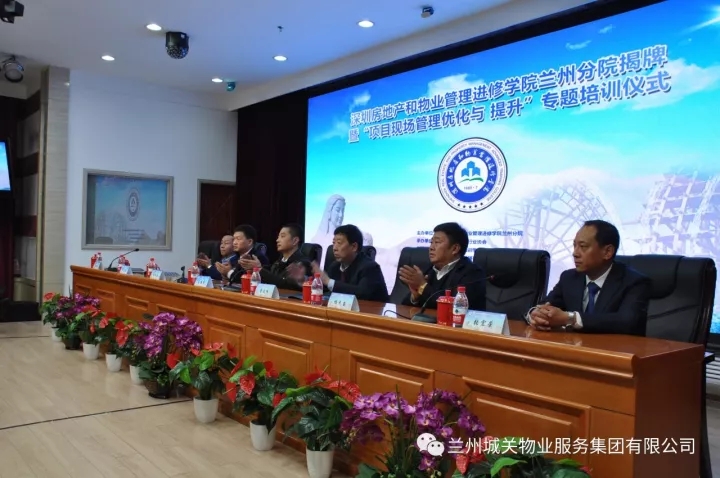 11月9日,深圳房地產(chǎn)和物業(yè)管理進(jìn)修學(xué)院蘭州分院揭牌暨“項目現場(chǎng)管理優(yōu)化與提升”專(zhuān)題培訓儀式在蘭州新聞出版大廈七樓多功能廳舉辦。蘭州市人力資源和社會(huì )保障局、蘭州市住房保障和房產(chǎn)管理局、蘭州市商務(wù)局等單位的領(lǐng)導及深圳房地產(chǎn)和物業(yè)管理進(jìn)修學(xué)院院長(cháng)劉業(yè)全、蘭州城關(guān)物業(yè)服務(wù)集團有限公司董事長(cháng)楊民召、甘肅新華飛天物業(yè)管理有限公司總經(jīng)理張建國等相關(guān)企業(yè)代表300余人出席了揭牌儀式。