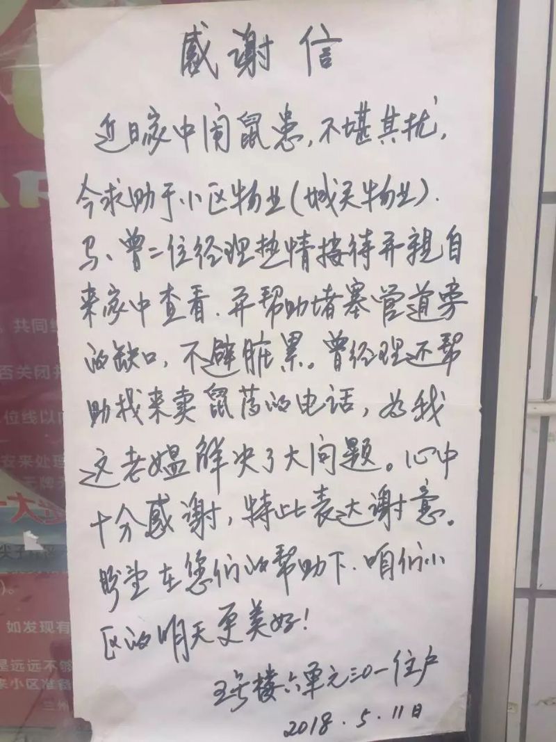 近日,市政府雁寧路小區院內張貼的一封感謝信,引起了大家的注意。原來(lái)這封感謝信是該小區業(yè)主所寫(xiě),簡(jiǎn)單樸實(shí)的語(yǔ)言中充滿(mǎn)了對城關(guān)物業(yè)工作人員的肯定與感激,字里行間體現出了對我們工作的支持和認可!