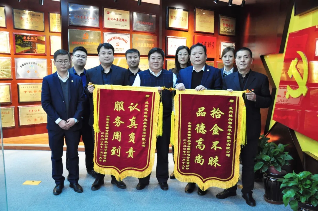 中國農業(yè)銀行甘肅省分行總務(wù)處總經(jīng)理孫雪峰把兩面錦旗送到蘭州城關(guān)物業(yè)服務(wù)集團有限公司董事長(cháng)楊民召手中,表達了對我們優(yōu)質(zhì)服務(wù)的肯定和感謝。