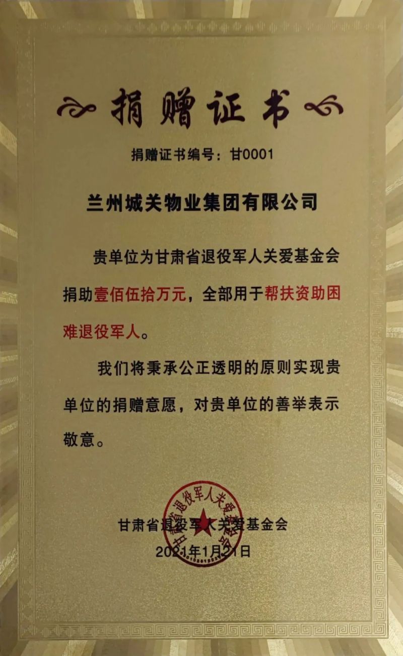 蘭州城關(guān)物業(yè)服務(wù)集團有限公司積極支持國防和軍隊建設,襄助退役軍人扶危濟困事業(yè),向甘肅省退役軍人關(guān)愛(ài)基金捐助150萬(wàn)元善款,以實(shí)際行動(dòng)為幫助退役軍人就業(yè)、解決退役軍人生產(chǎn)生活困難、加強軍政軍民團結工作貢獻力量、“錦上添花”。